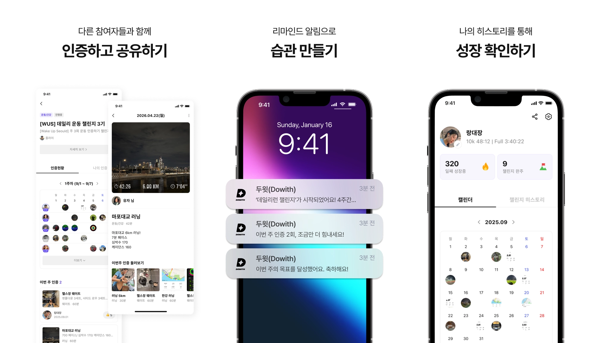 기록 경쟁이 아닌, 함께 루틴 만들기에 집중합니다. 빠른 사람이 이기는 게 아니라, 꾸준히 뛴 사람이 완주하는 구조에요!